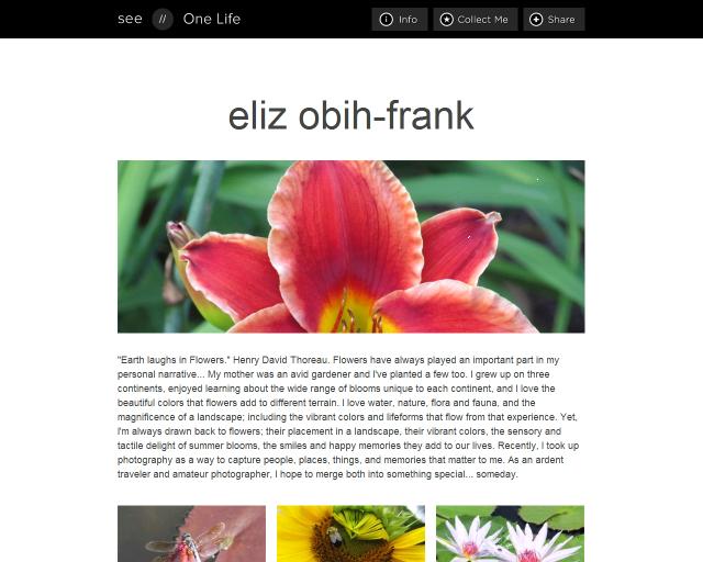 Here’s the rest in an email update they sent me: As a reminder, the Story Award winner will be selected from amongst the highest collected photographers. As of today, the highest collected entrants appear in 25 or more collections – get into 17 more collections to be eligible to win your choice between $7,500 and a Trip Around the World. Your Portfolio Link is: http://elizobihfrank.see.me/onelife2012 A huge THANK YOU!!! More below! 🙂